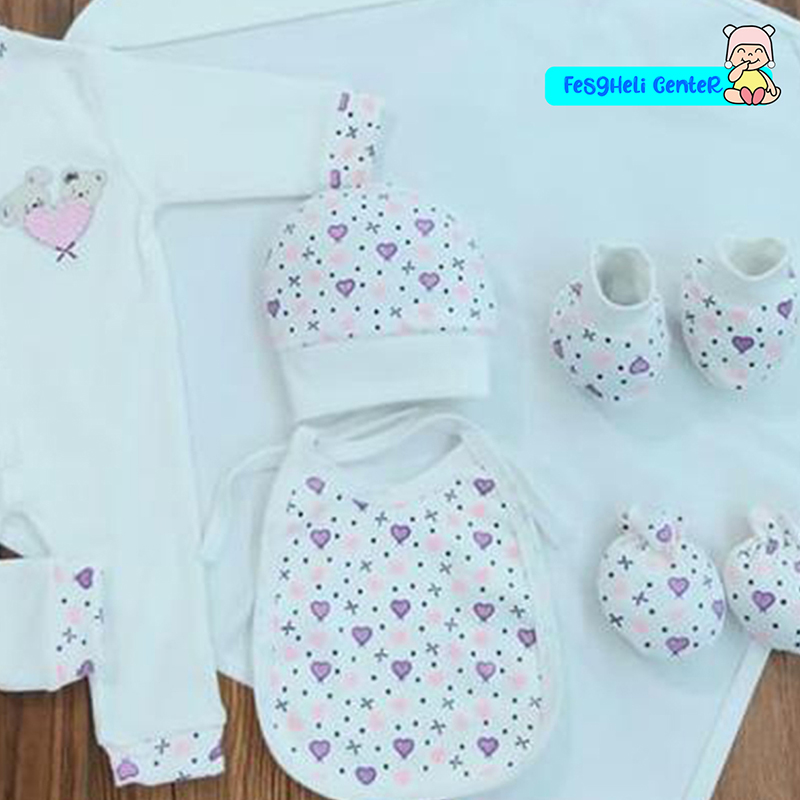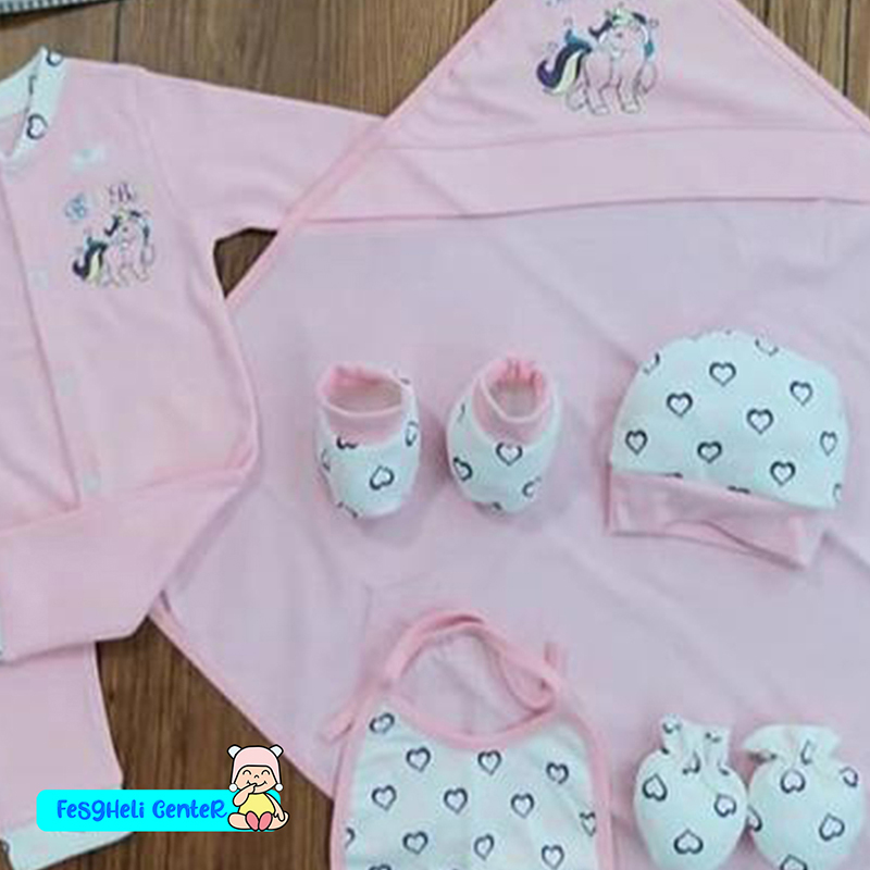 هفت تیکه شامل: سرهمی، حوله دورپیچ، کلاه، دستکش، پیشبند، پاپوش و چوب لباسی |